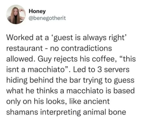 I’m talking about an asshole who ordered the wrong drink and assumed it was made incorrectly and is interrupting the service of others to fix his mistake.