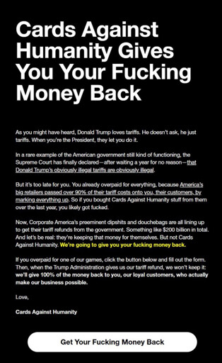 UnderpantsWeevil@lemmy.world to Not The Onion@lemmy.worldEnglish · 7 days agoCAH Gives You Your Fucking Money Backlemmy.worldimagemessage-square72linkfedilinkarrow-up11.76Karrow-down19