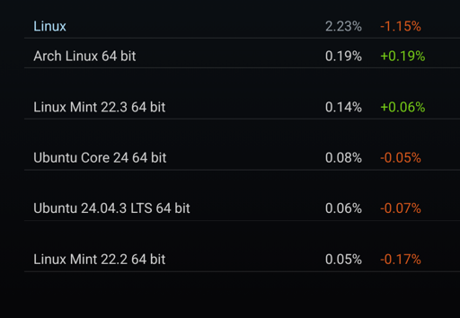 cm0002@lemmings.world to Linux@programming.dev · 13 days agoSteam hardware survey for February 2026. What happened? Why did it lose such a big percentage?lemmy.worldimagemessage-square42linkfedilinkarrow-up166arrow-down13