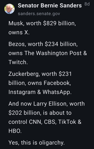 Unless he’s specifically talking about corporate holdings, then it’s oligopoly, not oligarchy.