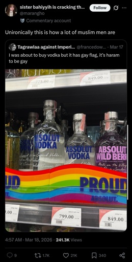 Alcohol is haram but the Pride flag is too much? Pal, when you’re five shots in your sexuality is the least of your worries.